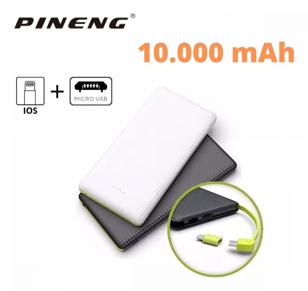 Power Bank Pineng PN-951 10.000Mah Carregue qualquer aparelho que possua entrada USB. Com o Pineng 10.000mAh. Cabo no padrão V8, serve em praticamente todos celulares com Android, acompanha também adaptador Lightning (Iphone) Características: - Agite para começar a carregar;- Duas saídas USB;- Indicador de nível de carga em LEDs;- Usa bateria de polímero de lítio para torna-lo mais fino e de alta performance;- Tecnologia pass through charging, pode carregar seus dispositivos e ser recarregado ao mesmo tempo;- Permite a recarga simultânea de dois aparelhos com muito mais velocidade;- Moderno sistema de gel, apresenta baixa dilatação e elimina riscos de vazamento;- Chip inteligente de reconhecimento, detecta automaticamente a tensão certa para não danificar seu celular;
