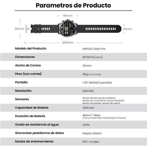 Tela AMOLED vibrante : tela de 1,43", resolução de 466* 466. Ligue e conecte: faça chamadas com seu pulso. Rastreamento da atividade física: 105 modos de treinamento e monitoramento da saúde. Funções versáteis: IP68, mostradores de relógio, assistente de voz, segurança. ATT: Se o seu dispositivo for iOS e você não quiser usar a função para reproduzir músicas ou vídeos, desligue o botão azul na interface da função de música do relógio. Para o sistema Android, você pode ajustá-lo na configuração do aplicativo Haylou Fun no celular. Atenciosamente Modelo do produto: HAYLOU Solar Pro - Dimensões: 55* 49* 12 (mm) - Largura da alça: 22 mm - Peso (com alça): 45 g (incluindo alça) - Tela AMOLED de 1,43 - Resolução: 466* 466 - Sensores: sensor de frequência cardíaca, sensor de movimento, sensor de SpO2, sensor de pressão, sensor de sono - Capacidade da bateria: 300 mAh - Duração da bateria: aproximadamente 7 dias (ativa o monitoramento da frequência cardíaca por 24 horas) - Grau de resistência à água: 2ATM - Plataforma de sincronização de dados: Haylou Watch - Modos de treinamento: mais de 100 modos tela AMOLED de 1,43 polegadas Design anti-sedimento, resistente e durável. Botões giratórios Gire o botão para aproveitar mais. Você pode selecionar vários menus e alterá-los à vontade. Chip Bluetooth avançado O chip Bluetooth 2 em 1 garante uma conexão fácil e estável com capacidade de processamento 80% mais rápida e a GPU 2.5D permite um papel de parede dinâmico e fluido. Qualidade militar, seja ousado e corajoso O Solar Pro provou ser aplicável a qualquer atividade ao ar livre e sob condições adversas, ajudando você a enfrentar um grande número de desafios de frente. Chamada Bluetooth com um switch Você pode fazer chamadas telefônicas via Bluetooth. O chip de decodificação de áudio integrado torna a qualidade do som tão impressionante quanto a alta fidelidade, desde graves profundos e ricos até um tom médio nítido e limpo. Função SOS, chamada automática de emergência * A função SOS precisa conectar o Bluetooth do celular e adicionar o número de contato de emergência. AI Voice Assistant * O recurso de assistente de voz requer o emparelhamento de um smartphone com recursos de assistente de voz via Bluetooth. Mais de 100 modos esportivos Alcance suas metas de condicionamento físico com precisão usando uma ampla variedade de modos esportivos personalizados, desde corrida até ioga. Monitoramento da saúde durante todo o dia Oferece muitos benefícios para seu smartwatch, garantindo que você possa monitorar e manter seu bem-estar durante todo o dia. Bateria de longa duração Habilitado por nossos extraordinários algoritmos de software, o smartwatch garante uma longa duração da bateria, um tempo de espera de 20 dias e 7 dias para uso diário.